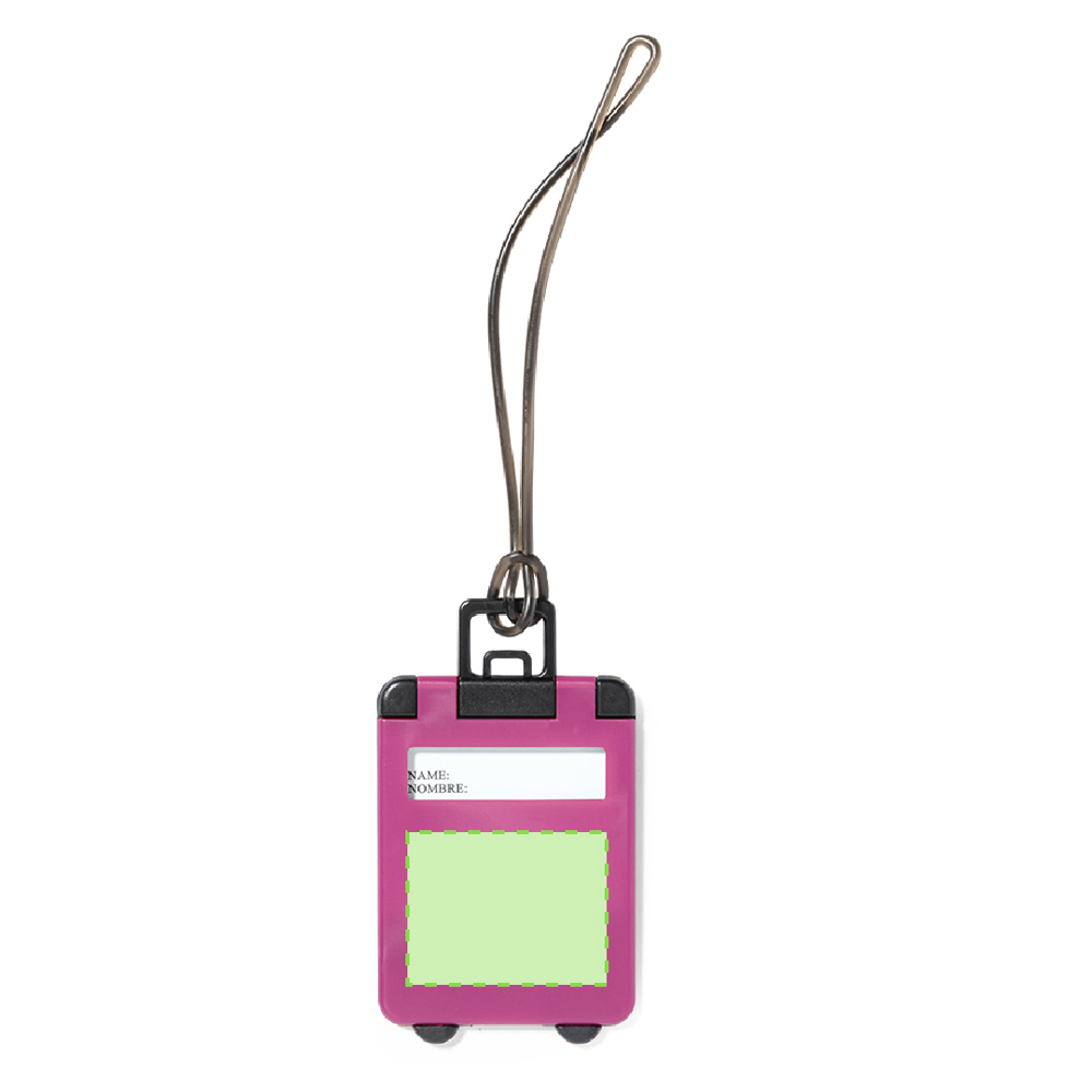 Bagage label in origineel design van stevig tweekleurig materiaal en in verschillende kleuren. Met stevige koppelingsriem en identificatiekaart in het Spaans en in het Engels.