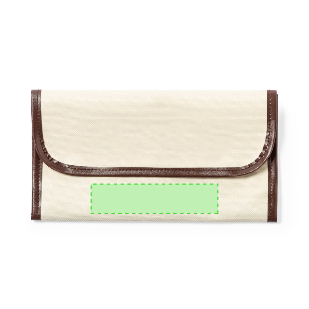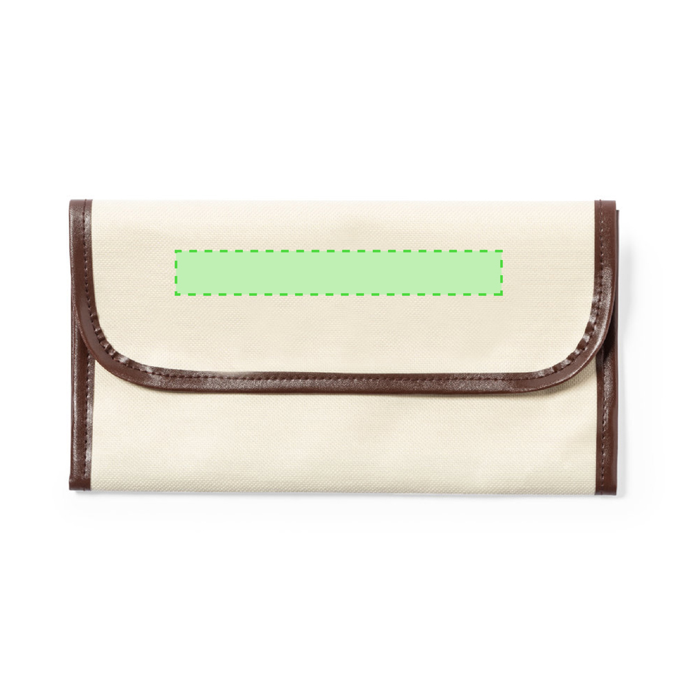 Reisdocumentenhouder van duurzaam 600D in naturel finish, met bruine PU lederen bies en verstevigingen. Flap met klittenbandsluiting en meerdere binnenvakken.